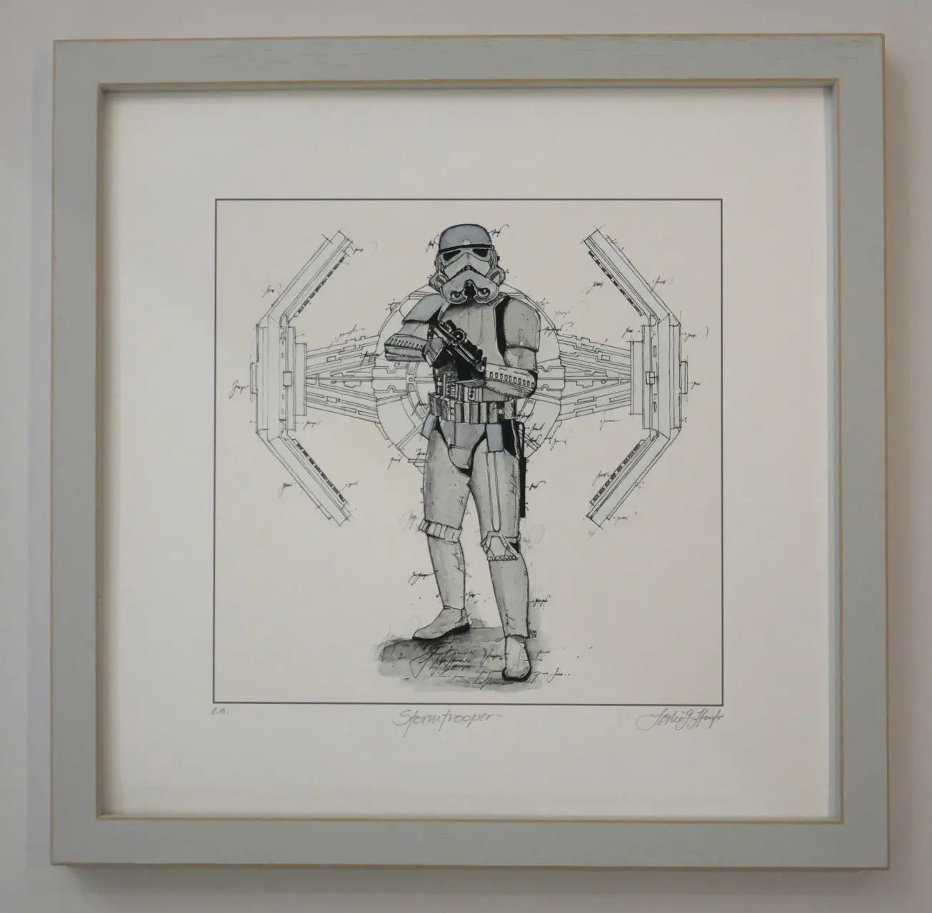 Leslie G. Hunt verbindet in seinem handsignierten Giclée Print „Stormtrooper“ ikonische Star Wars-Ästhetik mit künstlerischer Raffinesse. Das Werk auf hochwertigem Aquarellbütten ist in zwei Größen (30x30 cm und 70x70 cm) erhältlich und besticht durch seine detailreiche Darstellung vor technischem Hintergrund. Die limitierte Auflage macht dieses Kunstwerk zu einem begehrten Sammlerstück für Pop Art- und Star Wars-Fans.