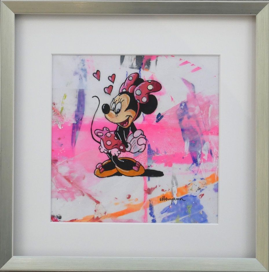 Andrea Ottenjann bringt mit ihrem Werk 'Minnie' pure Lebensfreude an die Wand. Die charmante Minnie Mouse, liebevoll in Acryl auf Folie und beidseitig bemalt, strahlt auf 30 x 30 cm in leuchtenden Farben. Die Künstlerin kombiniert gekonnt Mixed Media mit Pop Art und verleiht dem Disney-Klassiker eine moderne, einzigartige Note. Ein handsigniertes Unikat, das Comic-Fans und Kunstliebhaber gleichermaßen begeistert.