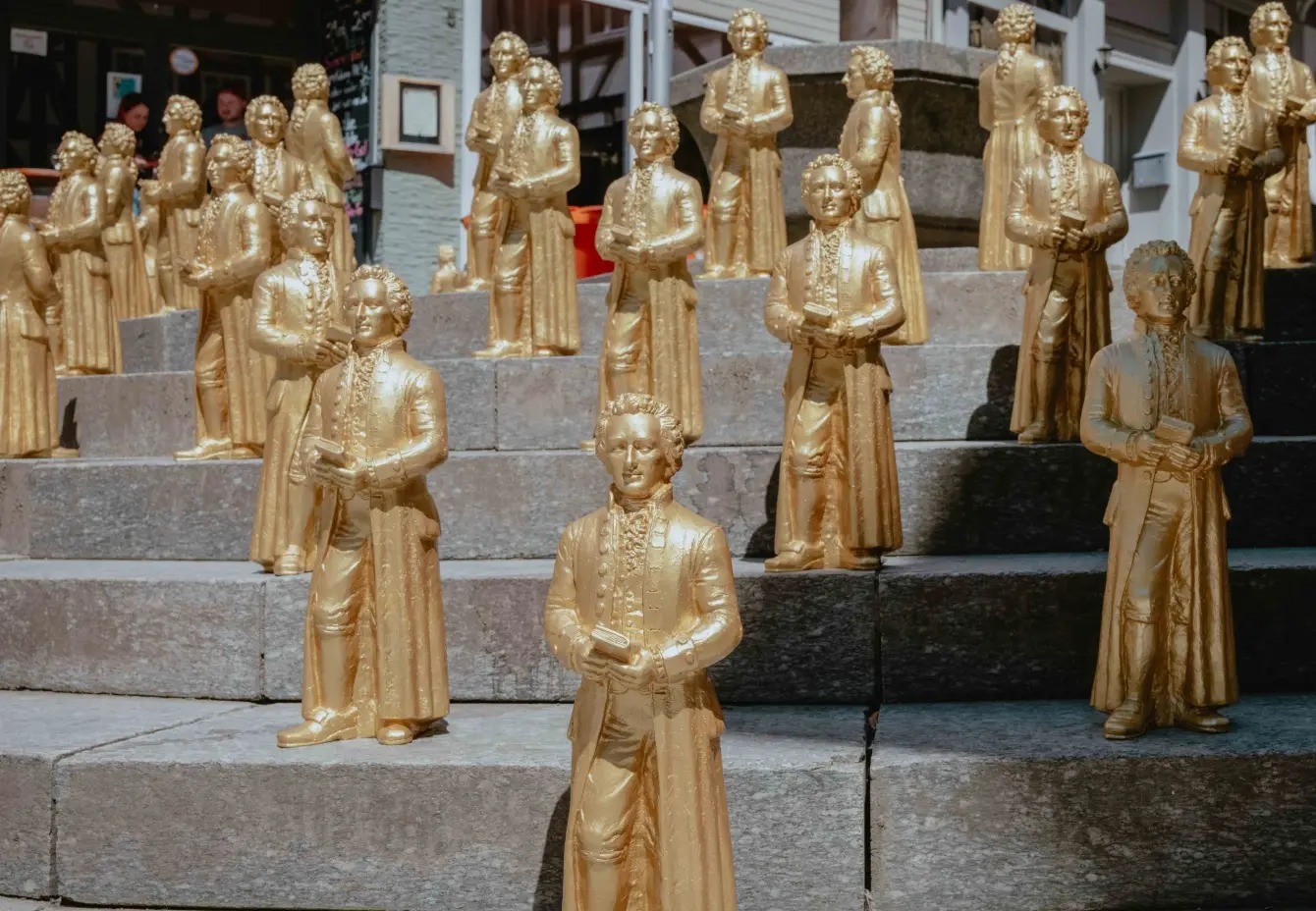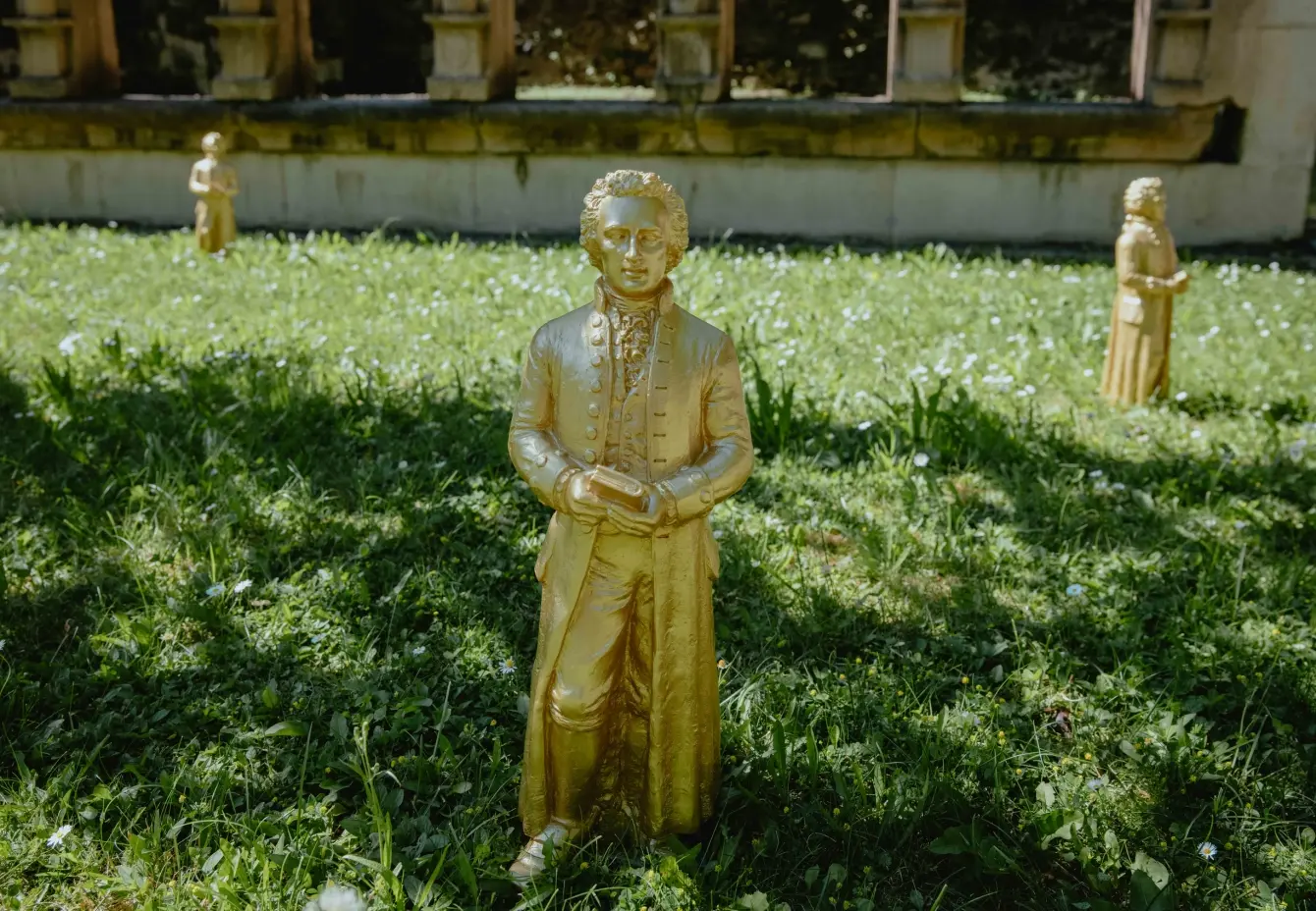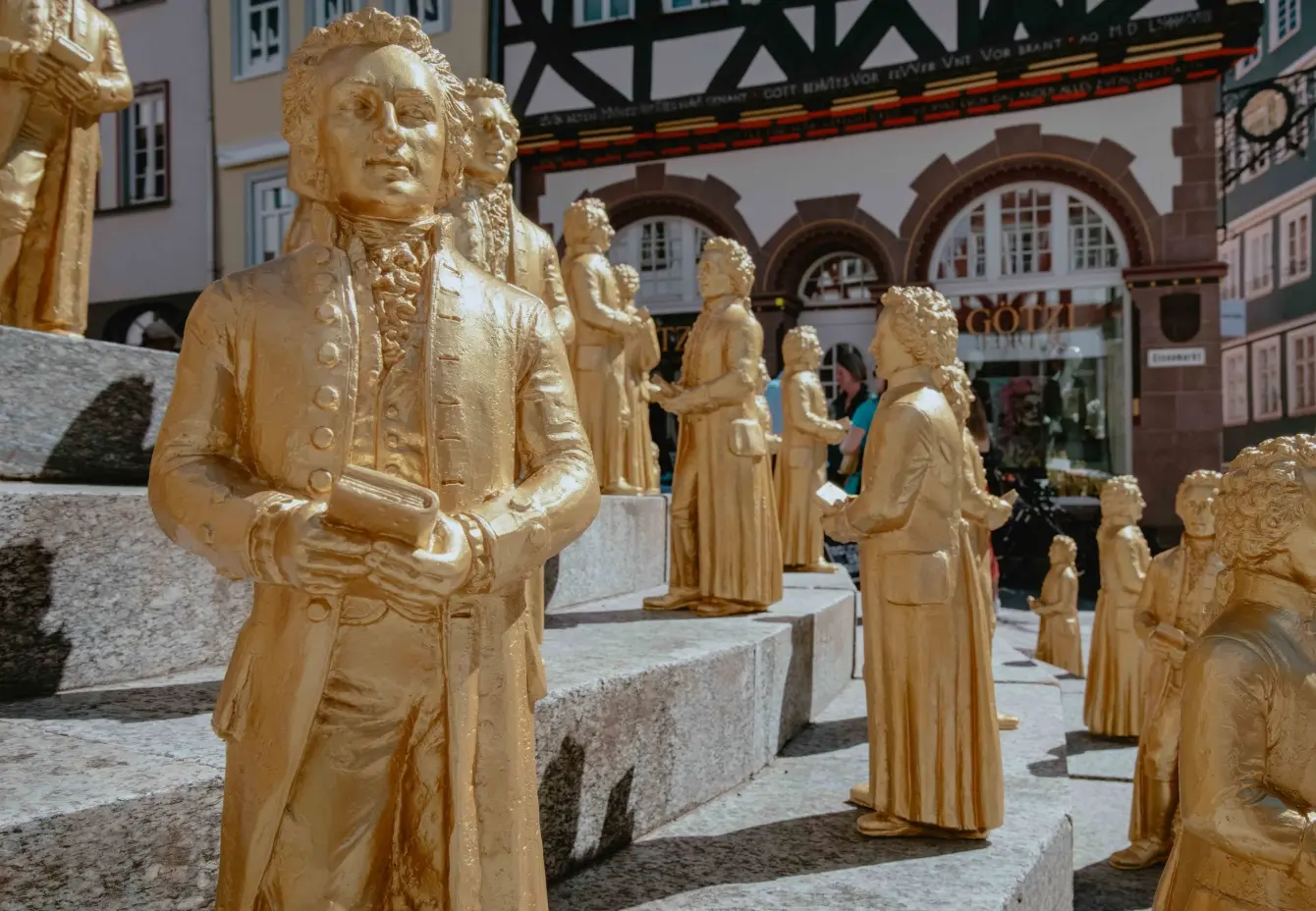 Ottmar Hörls goldfarbene Skulptur „Der junge Goethe“ ist eine Hommage an den berühmten Dichter. Die etwa 53 cm hohe Figur aus Kunststoff zeigt Goethe in elegantem Gehrock, mit seinem Werk „Werther“ in den Händen. Die detailreiche Konzeptkunst feiert Goethes Zeit in Wetzlar und bringt einen Hauch von Geschichte und Glanz in jedes Zuhause. Ideal als Geschenk oder Sammlerstück für Kunst- und Literaturfreunde.