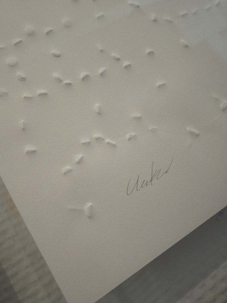 Dieses beeindruckende Werk von Günther Uecker besticht durch seine einzigartige Prägedruck-Technik. Die handsignierte Originalgrafik misst 69 x 69 cm und wird durch eine hochwertige, konservatorische Rahmung zwischen Doppelglas perfekt in Szene gesetzt. Die reliefartige Struktur des Papiers verleiht dem abstrakten Kunstwerk eine besondere Haptik und Tiefe – ein faszinierendes Sammlerstück zeitgenössischer Kunst.