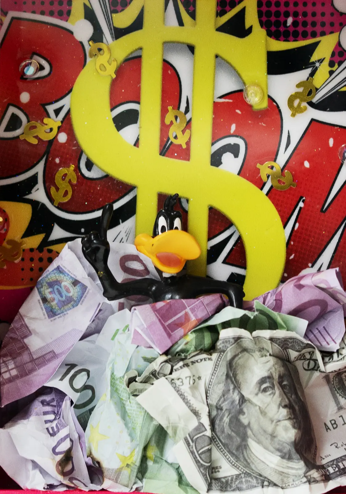 Baron Tariq bringt mit "Egal woher, Hauptsache knackig" Comic-Charme und Popkultur in Ihr Zuhause. Die 28 x 34 cm große Mixed-Media-Collage zeigt Duffy Duck, umgeben von Geldscheinen, vor einem farbenfrohen Comic-Hintergrund. Jede Arbeit ist ein handgefertigtes Unikat und fängt den Witz und die Nostalgie unserer Kindheitshelden ein – ein echtes Highlight für Sammler und Fans limitierter Kunstwerke.