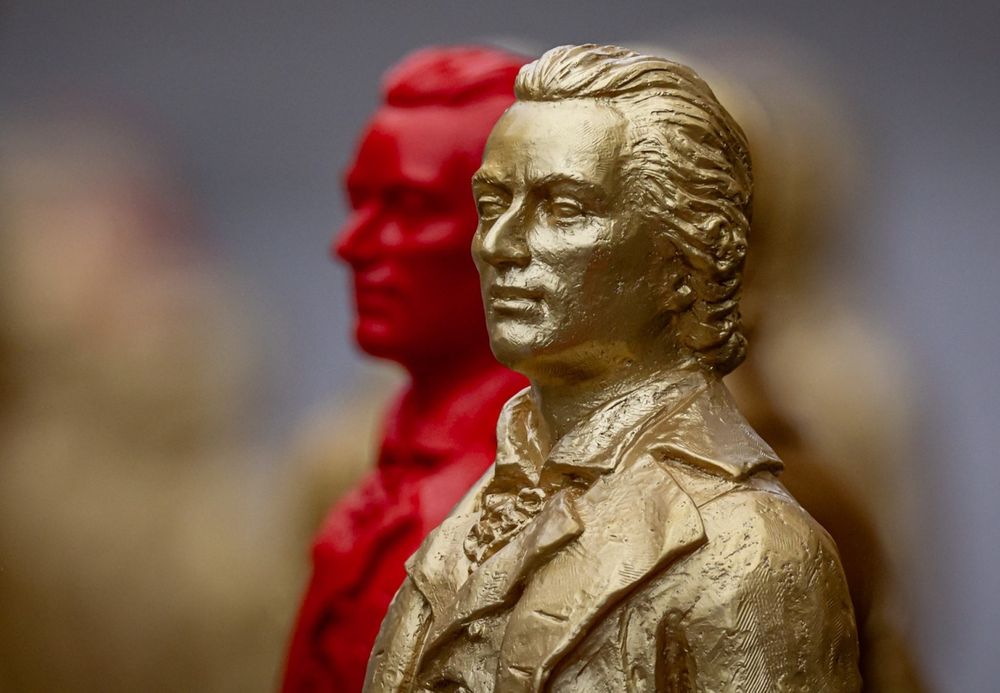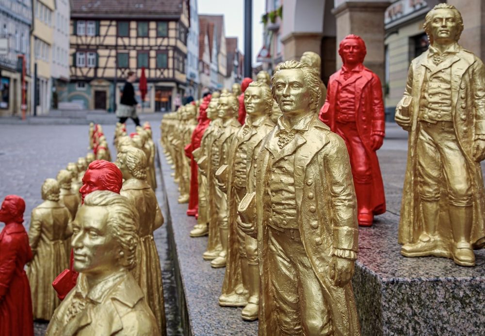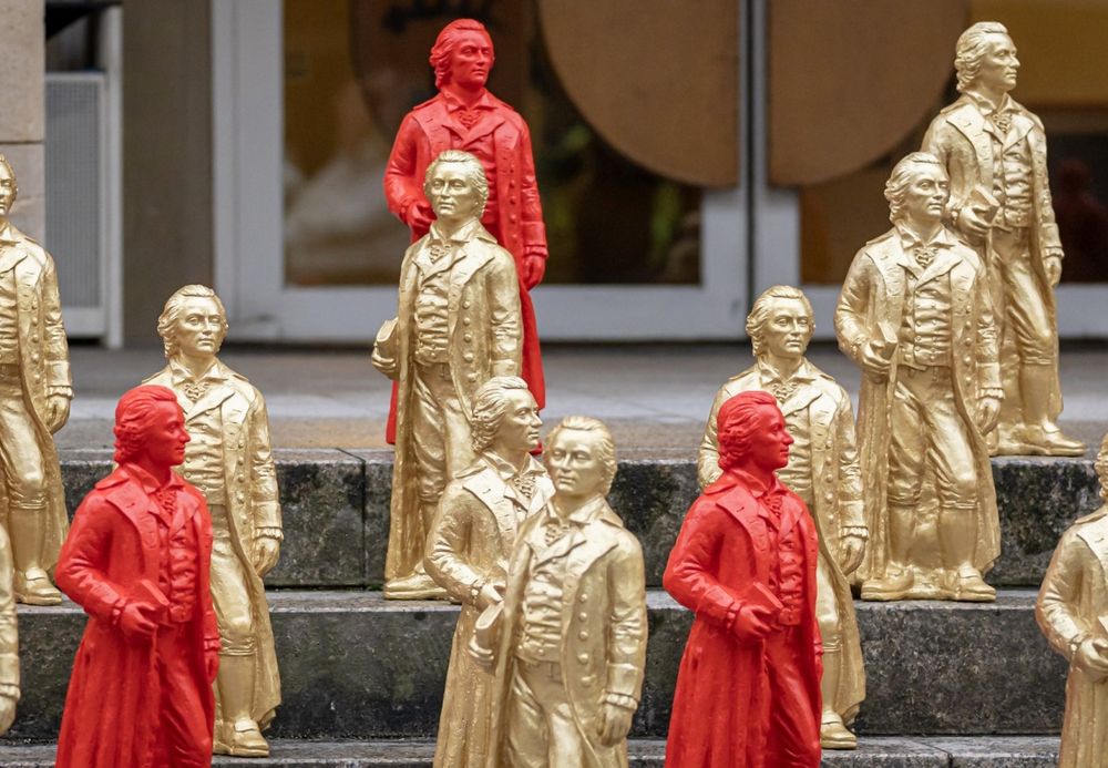 Die goldene Skulptur „Friedrich Schiller“ von Ottmar Hörl ist ein eindrucksvolles Statement zeitgenössischer Konzeptkunst. Mit einer Größe von 53 x 18 x 18 cm aus hochwertigem Kunststoff gefertigt, erinnert sie an das berühmte Schiller-Projekt in Marbach am Neckar. Die Prägung HÖRL unterstreicht die Authentizität. Ein einzigartiges Sammlerstück für Liebhaber bedeutender Persönlichkeiten und moderner Kunst.