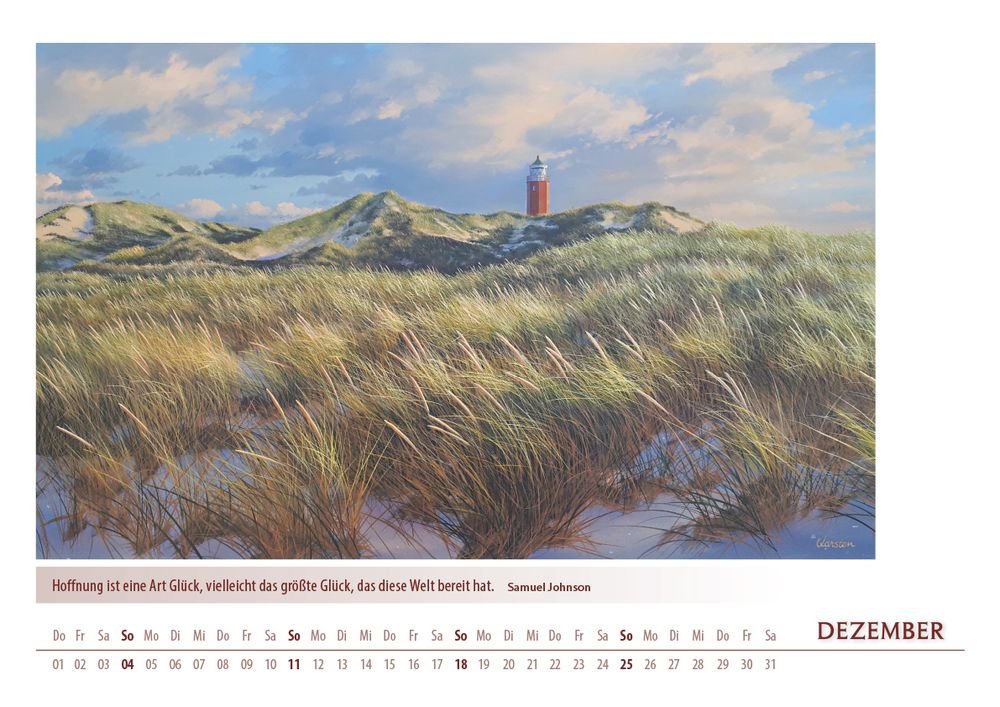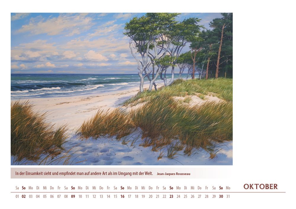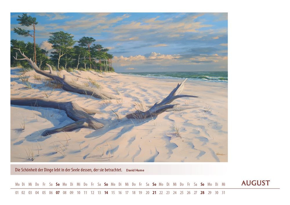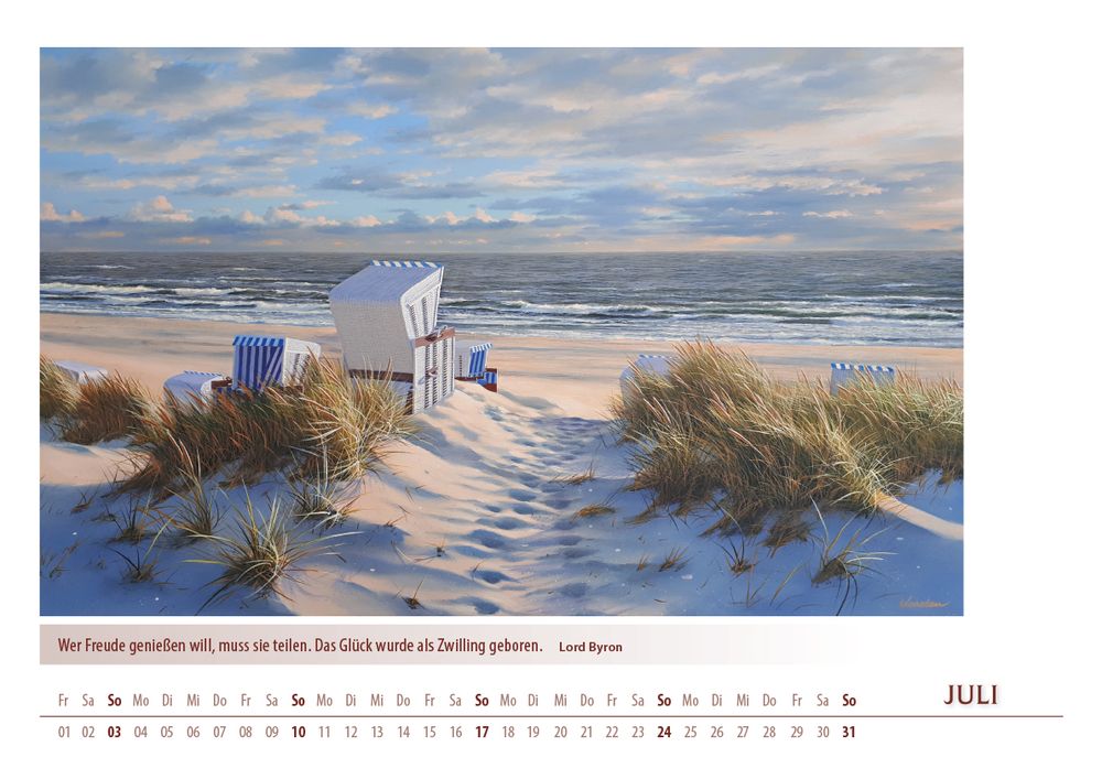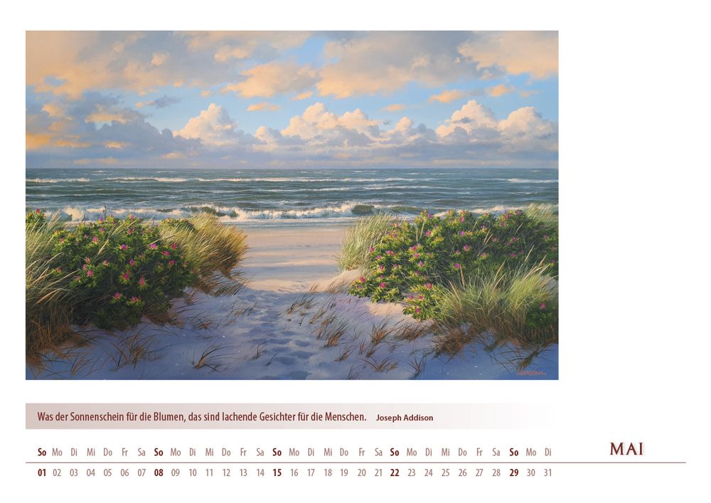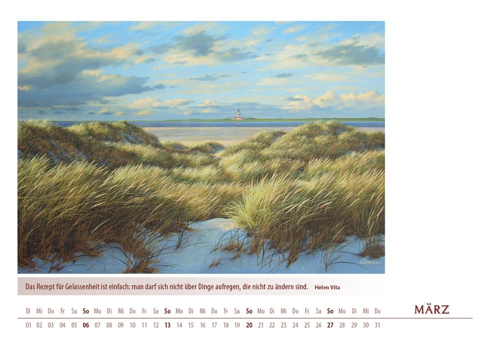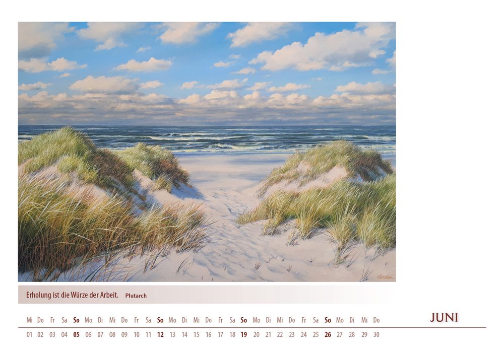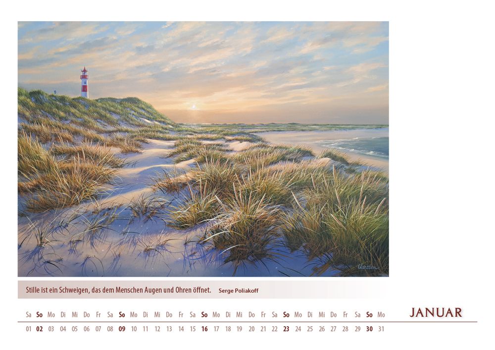 Der Kalender 'Meerblicke 2022' von Karsten Meiwald entführt Sie Monat für Monat an die Küste. Zwölf stimmungsvolle Motive, inspiriert von Meer, Dünen und entspannter Atmosphäre, bringen maritimes Flair in Ihr Zuhause. Im großzügigen DIN A3-Format (42 x 29,7 cm) kommen die hochwertigen Kunstdrucke besonders gut zur Geltung. Ein ideales Geschenk für alle, die das Meer lieben und sich nach Erholung sehnen.