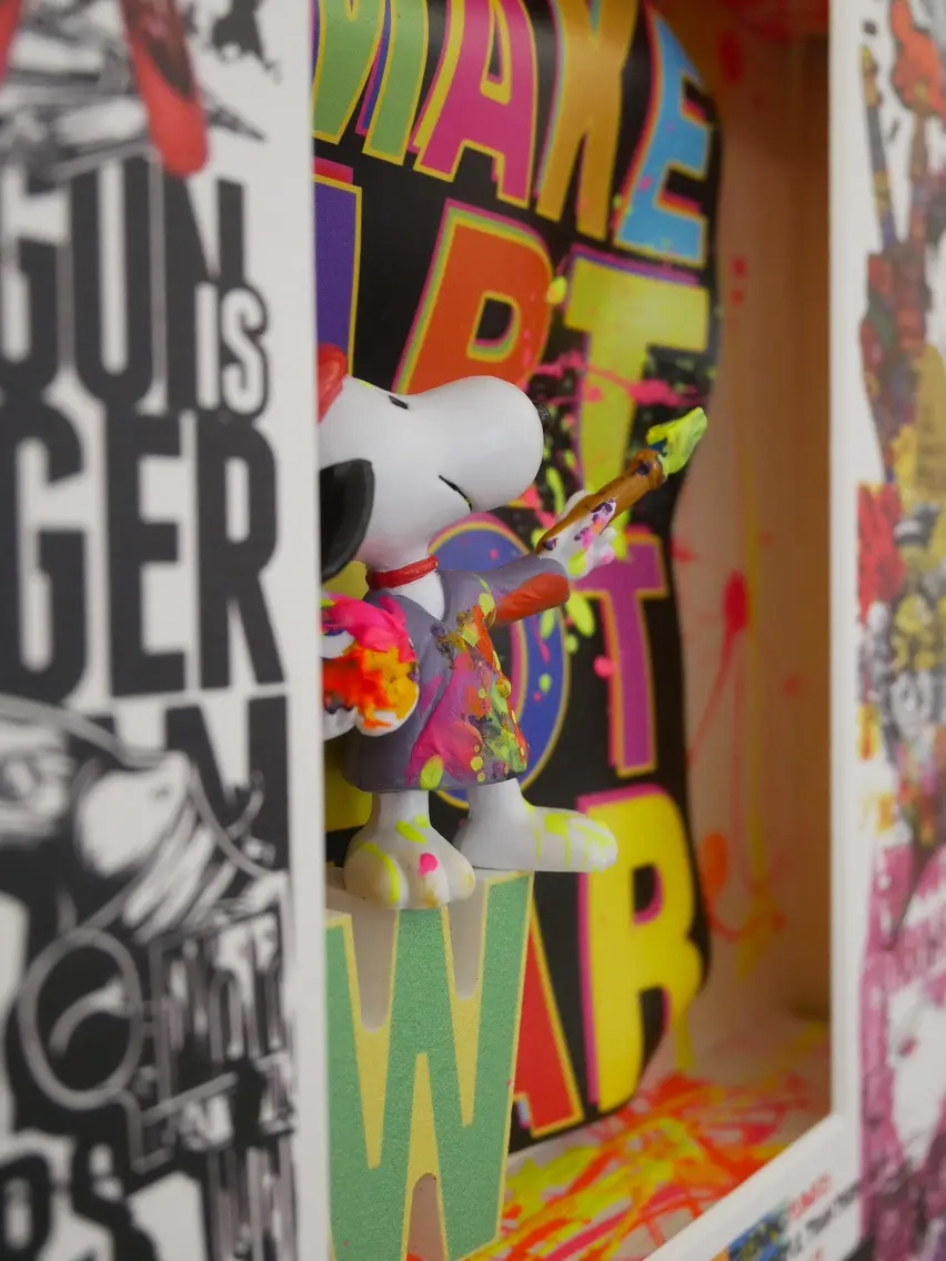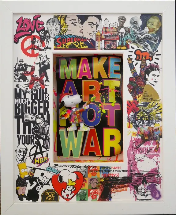 Baron Tariqs Werk „Make Art Not War“ (28 x 34 cm) vereint Streetart, Comic und Pop Art zu einem farbenfrohen Statement. Im Mittelpunkt steht Snoopy als Picasso, der mit Pinsel und Palette für Kreativität statt Konflikt wirbt. Die handgefertigte Mixed Media Collage überzeugt durch ihre plastische Tiefe und originelle Gestaltung – ein echtes Highlight für Kunst- und Comicliebhaber.