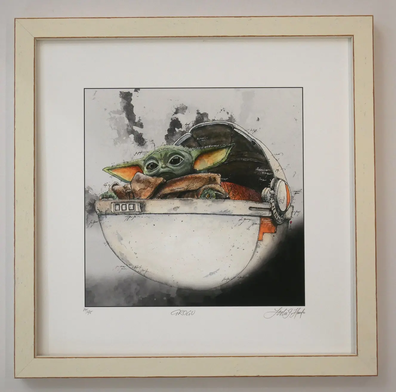 Grogu, der kleine Star aus dem Star Wars Universum, wurde von Leslie G. Hunt liebevoll als Giclée Print auf hochwertigem Aquarellbütten verewigt. Das Werk begeistert mit detailreicher Illustration und charmantem Comic-Stil. Erhältlich in 30x30 cm (300er Auflage) oder 70x70 cm (100er Auflage), jeweils handsigniert. Optional mit Rahmen – ein Highlight für Fans und Sammler moderner Popkultur.
